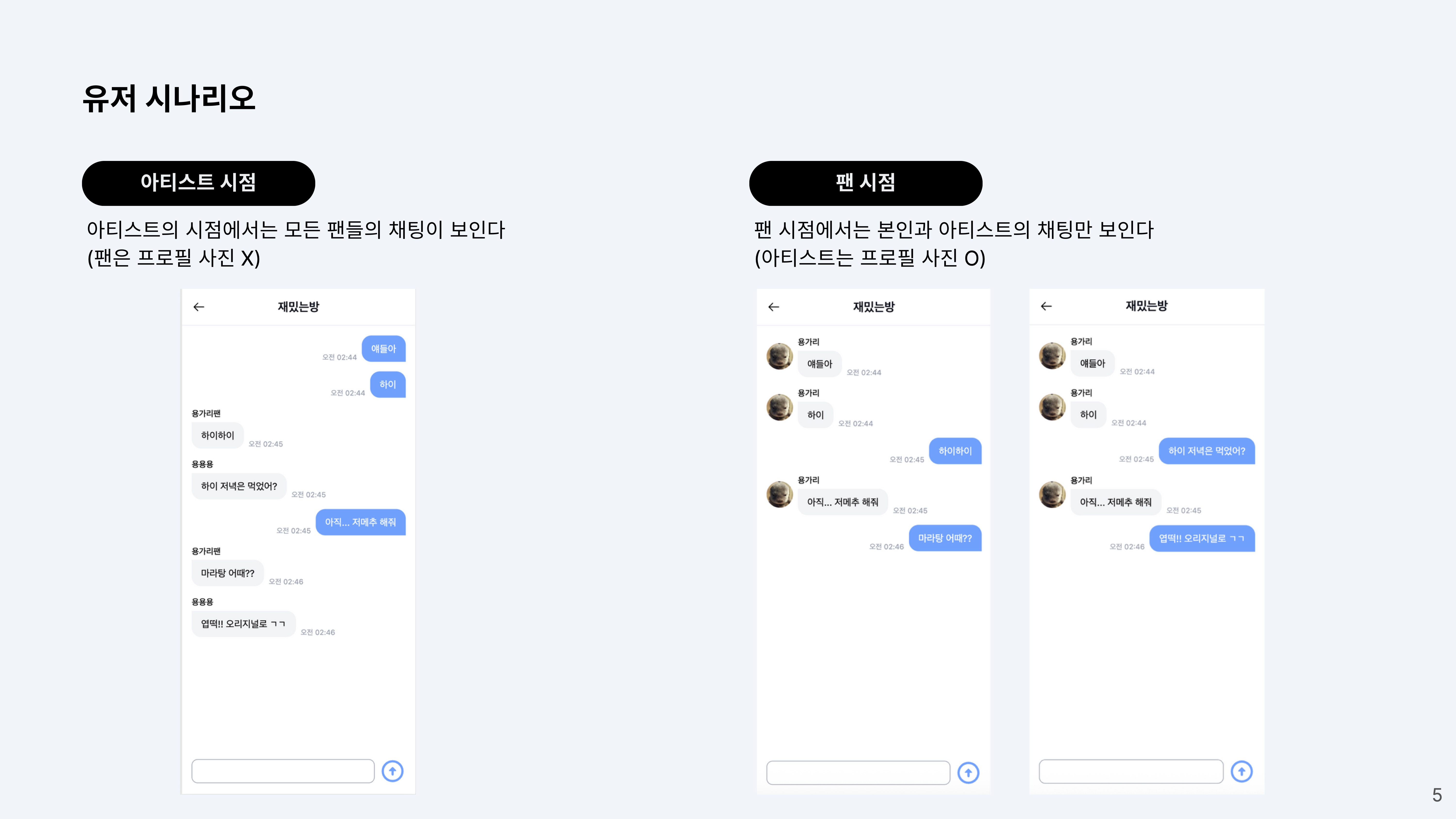 위 구독에서 설명한 것 처럼 아티스트는 팬/아티스트를 구독해 모든 메세지를 볼 수 있고, 팬은 본인/아티스트를 구독해, 본인 메세지와 아티스트 메세지만 보이는 화면이다.